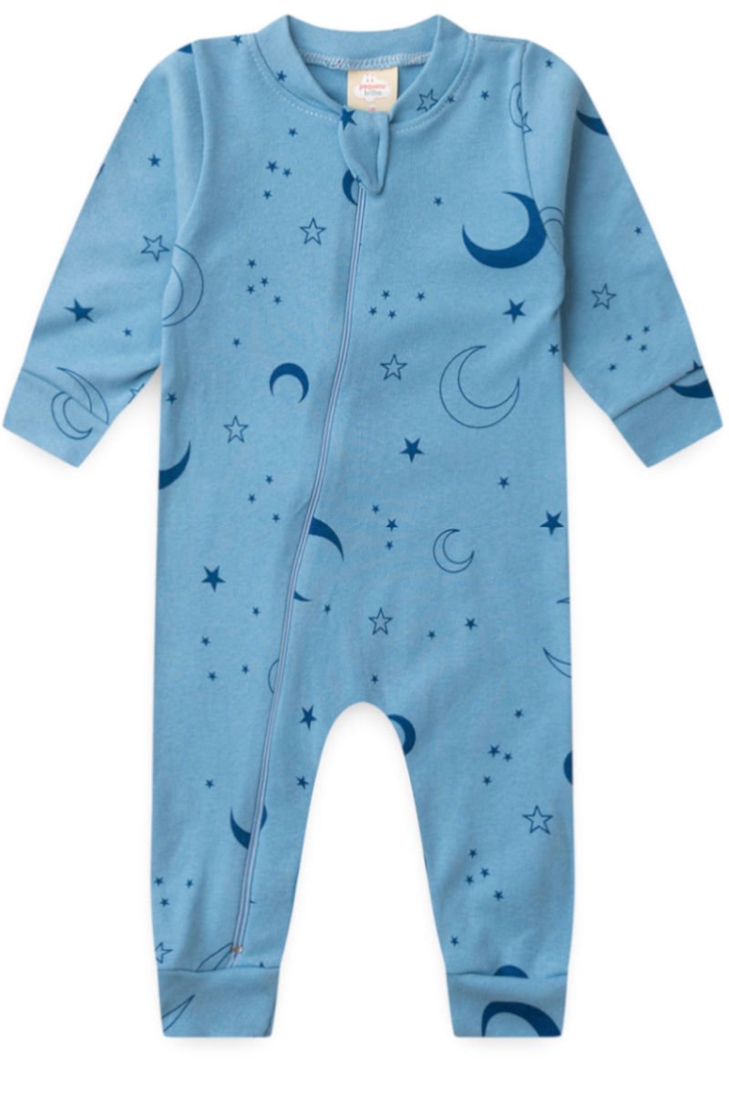 - Vista o Macacão Azul Suedine com um body branco por baixo. É ideal para rolar no tapete, amamentar ou tirar uma soneca, com zíper que agiliza a troca de fralda.